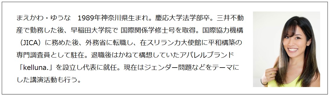 さまざまな分野で活躍する方にお話をうかがうインタビュー「グローバル・コネクター®」。今回のゲストは、女性雇用の研究者として渡ったスリランカとの出会いをきっかけに起業し、現在は現地女性たちの作るフィットネス・ウェアを販売するアパレルブランド「kelluna.」(ケルナ)の代表を務める前川裕奈さんです。(写真はいずれも本人提供)